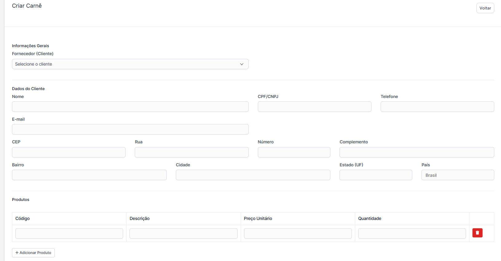 Clique em ➕ novo carnê criar um novo carnê personalizado, informando: