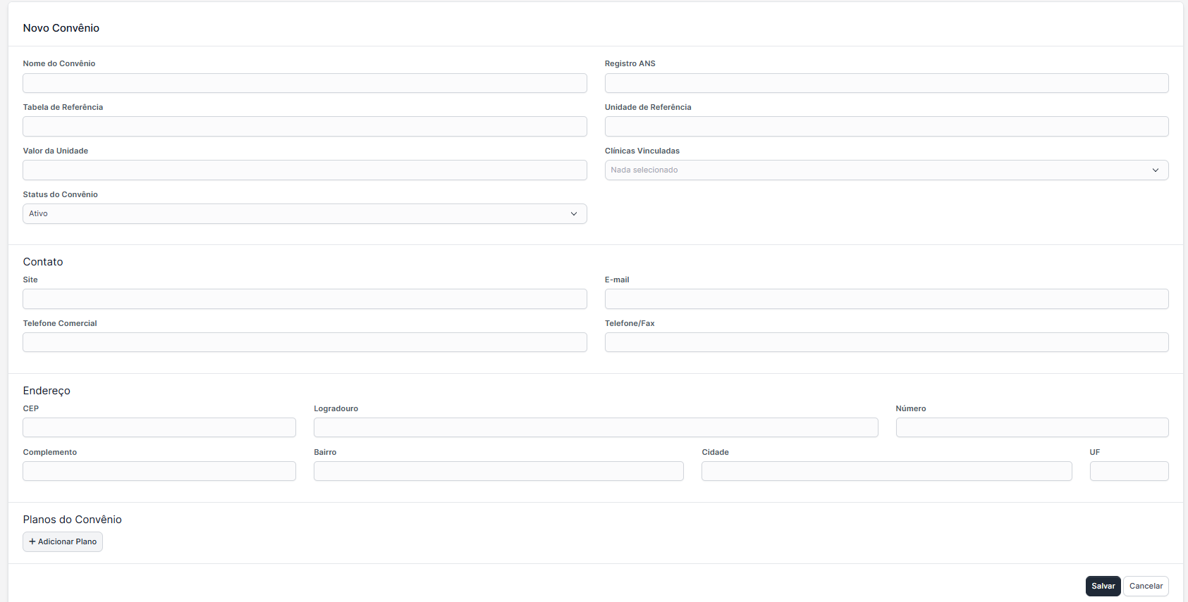 Na tela de Novo Convênio, você realiza o cadastro completo de um convênio aceito pela clínica. Basta preencher os campos com as informações principais, como: