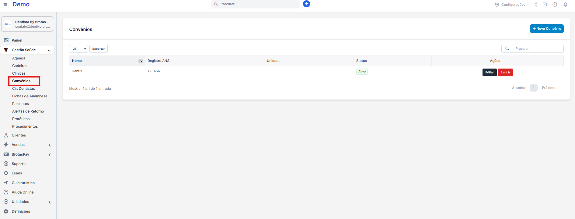 Neste espaço, você cadastra e gerência os convênios aceitos na clínica. Visualize informações como nome, número de registro na ANS, unidade vinculada e status de atividade. Tudo centralizado para facilitar o controle e o atendimento de pacientes conveniados.