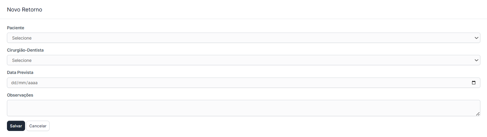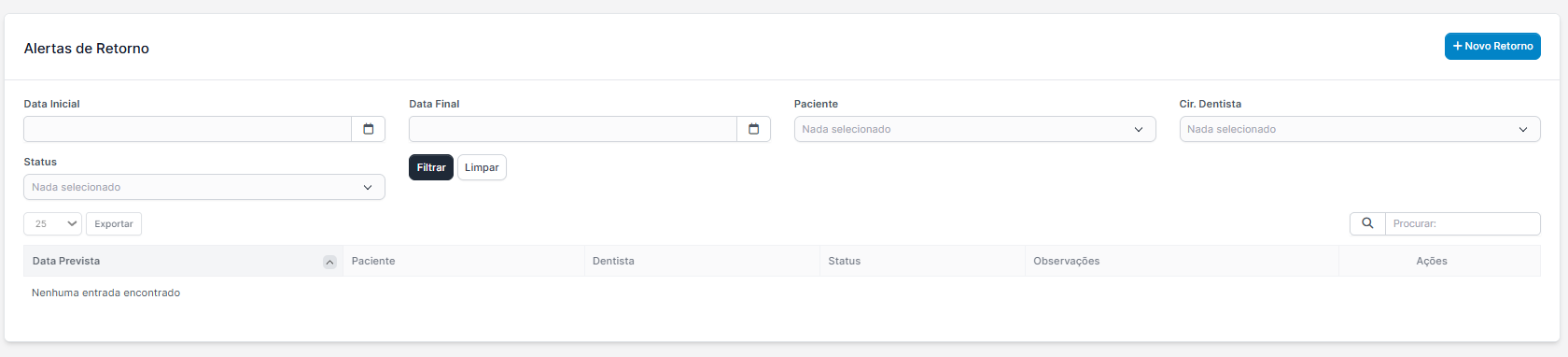 Este recurso permite visualizar e gerenciar os retornos agendados dos pacientes em um período específico. É possível filtrar os alertas por data, paciente, cirurgião-dentista e status do retorno. Assim, a clínica garante um acompanhamento eficiente e evita faltas ou esquecimentos nos atendimentos futuros.