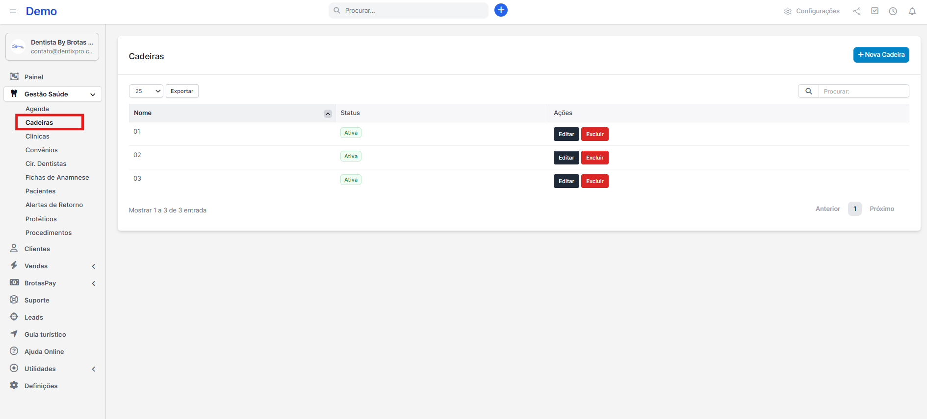No módulo "Cadeiras", é possível cadastrar, visualizar e gerenciar todas as cadeiras disponíveis no consultório. Cada cadeira representa uma unidade de atendimento, permitindo organizar a agenda por profissional ou sala. O status de cada cadeira (ativa/inativa) facilita o controle e evita conflitos de agendamento, tornando a rotina mais eficiente e organizada.