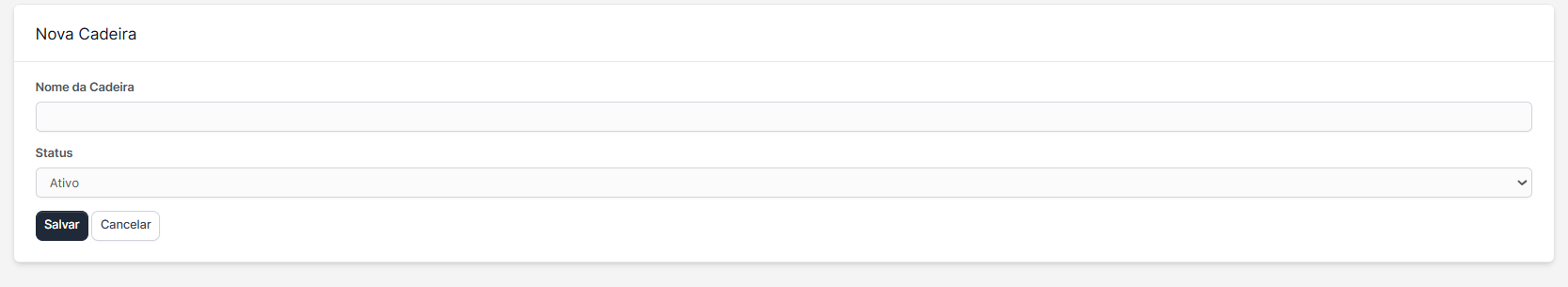 Clique + Nova Cadeira para cadastrar e preencha os dados abaixo: