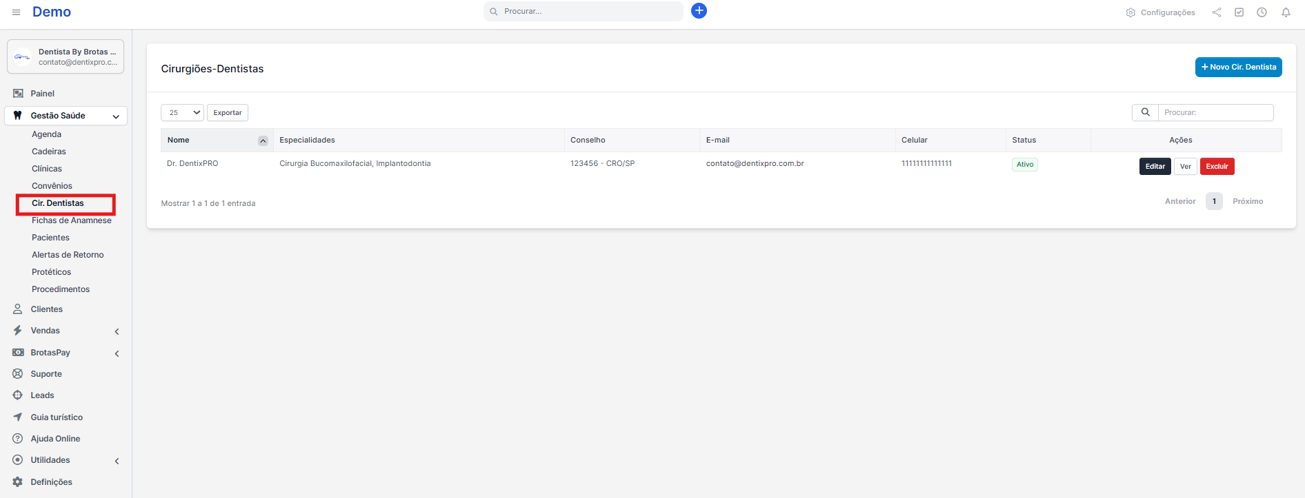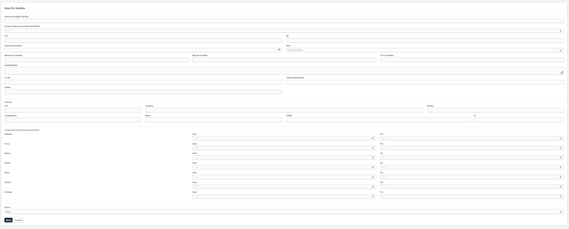Clique em + Novo Cir. Dentista para registrar um novo Cir. Dentista e preencha os dados: