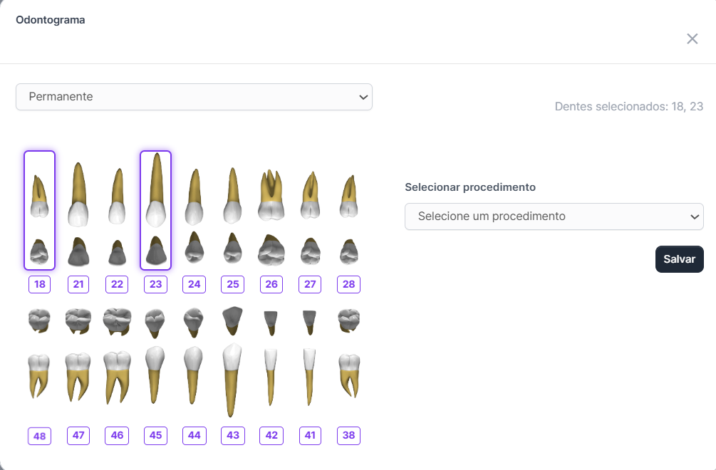 4️⃣ Registre o procedimento: Depois de marcar os dentes, associe o procedimento (por exemplo: obturação, limpeza, canal).