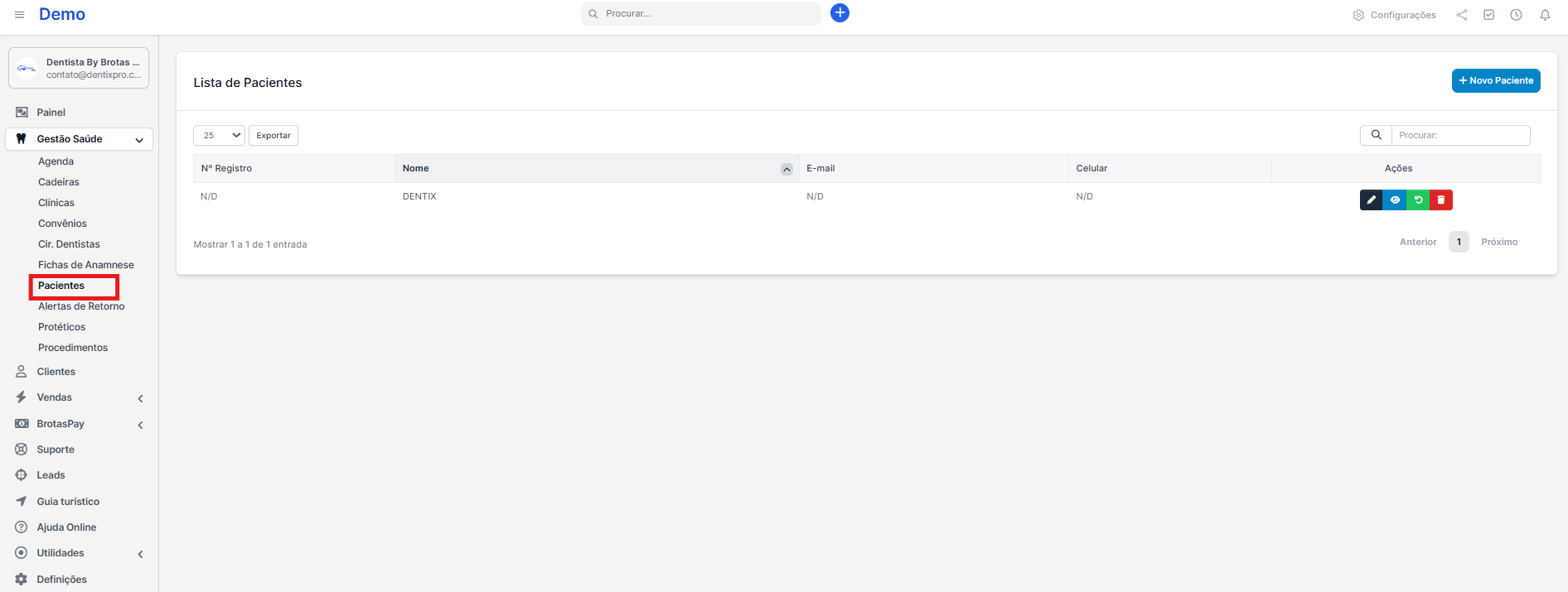 Este recurso exibe todos os pacientes cadastrados na plataforma, permitindo a busca e o gerenciamento rápido das informações básicas, como nome, e-mail e celular. Através da lista, você pode acessar detalhes e realizar ações específicas para cada paciente, facilitando o controle do atendimento odontológico.