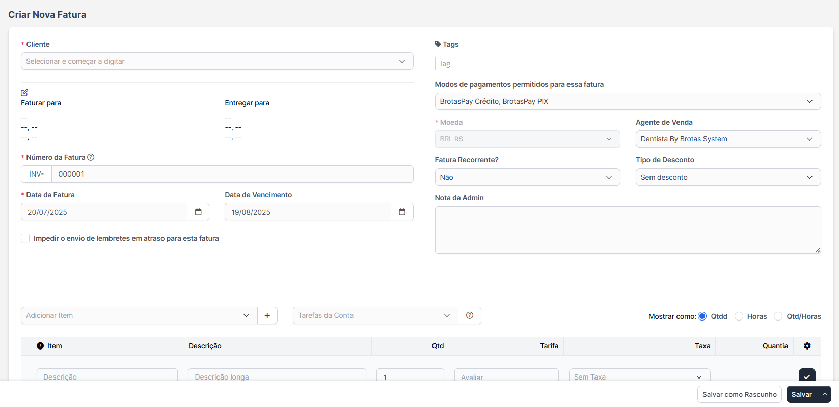 Clique em ➕ criar nova fatura: